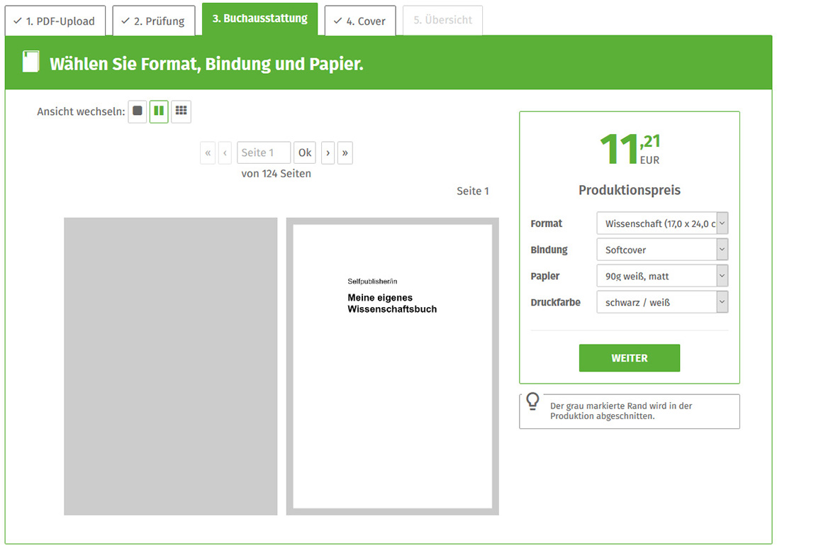epubli bietet Ihnen eine große Ausstattungsvielfalt an Formaten, Papieren und Bindungen. Bei unserem Wissenschaft-Format können Sie zwischen dem matten Standardpapier 90 g/m² in weiß oder cremeweiß sowie dem Bilderdruckpapier 150 g/m² weiß glänzend oder der Grammatur 170 g/m² weiß matt wählen. Je nach Seitenanzahl stehen Ihnen die Bindungsarten Heftbindung, Ringbindung, Softcover oder Hardcover zur Verfügung.