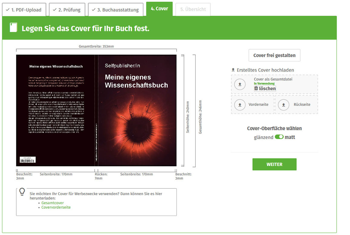 Für den Buchdruck bei epubli benötigen Sie lediglich eine druckfähige PDF-Datei Ihres Buchinhalts. Wichtige Hinweise und Tipps zur Erstellung eines solchen PDFs finden Sie in unserem Hilfebereich. Für das Erstellen der Inhaltsdatei können Sie gern auf unsere kostenlose Word-Formatvorlage zurückgreifen. Das Buchcover können Sie während des Uploadprozesses separat hinzufügen oder dort bequem mit unserem Cover Designer gestalten.