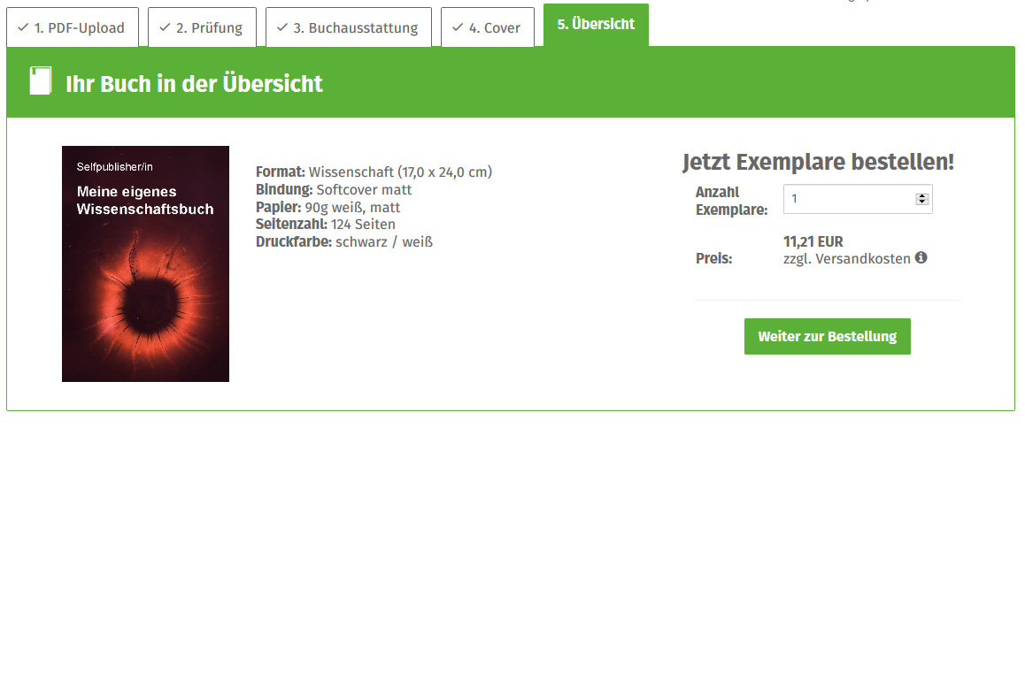 Haben Sie Ihr Wissenschaftsbuch erfolgreich mit einer Schreib- oder Layoutsoftware Ihrer Wahl erstellt, sind es nur noch fünf Schritte bis zum fertigen Buch. Bei epubli können Sie Ihr Buch unkompliziert, hochwertig und preiswert drucken lassen.