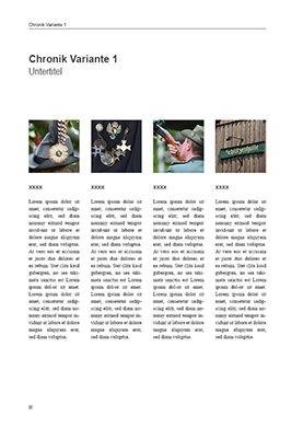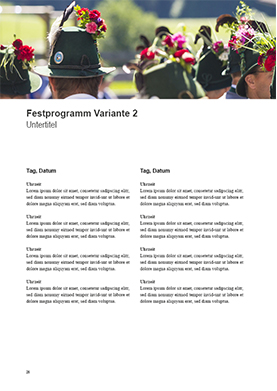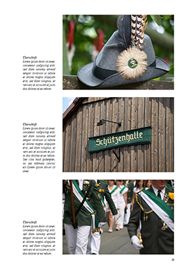 Bildergalerien sind ein essentieller Bestandteil von Festschriften für Schützengesellschaften und Bruderschaften. Sie machen Tradition und Brauchtum für jeden Schützen greifbar und lassen Erinnerungen an Schützenfeste und Königspaare lange lebendig bleiben. Eindrücke von Königschießen, Festzug und Schützenball sollten in solchen Fotogalerien ebenso wenig fehlen wie Nahaufnahmen der Königskette bzw. von Schützentrachten und Vereinsfahnen. Nutzen Sie Bilder ebenso wie farbige Highlights – zum Beispiel Grün für Überschriften, Zitate und Trennlinien – auch auf anderen Seiten, um z.B. längere Textpassagen visuell aufzulockern.
