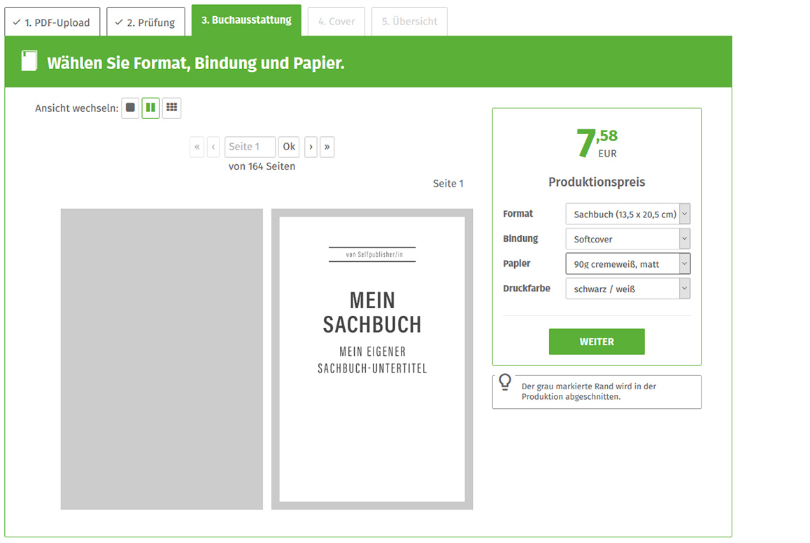 epubli bietet Ihnen eine große Ausstattungsvielfalt an Buchformaten, Papiersorten und Bindungsarten. Bei unserem Sachbuch-Format können Sie zwischen dem matten Standardpapier 90 g/m² in weiß oder cremeweiß sowie dem Bilderdruckpapier 150 g/m² weiß glänzend oder der Grammatur 170 g/m² weiß matt wählen. Abhängig von der Seitenanzahl stehen Ihnen die Bindungen Heftbindung, Ringbindung, Softcover oder Hardcover zur Verfügung.