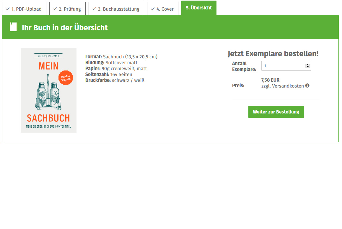 Die Druckkosten für Ihr Sachbuch variieren je nach gewählter Buchausstattung. Der Preis für einen Titel im Sachbuch-Format mit Softcover, 90 g/m² Papier sowie 40 Schwarz-Weißen-Seiten und 10 Farbseiten beträgt beispielsweise 4,95 Euro. Weitere Preisbeispiele finden Sie weiter oben auf dieser Seite. Ermitteln Sie Ihren individuellen Druckpreis mit unserem praktischen Preisrechner. Bei einer Bestellung ab 25 Exemplaren profitieren Sie von unserem gestaffelten Mengenrabatt: