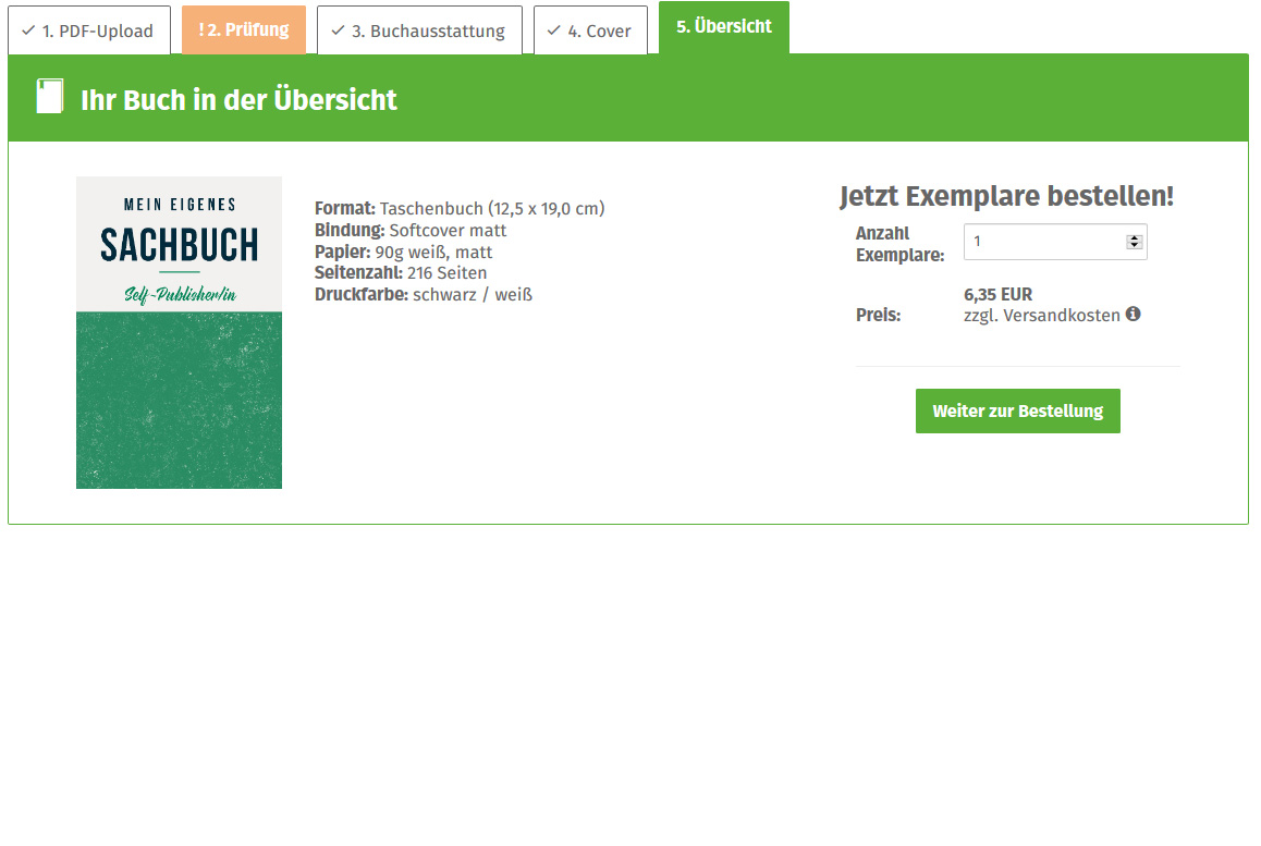 Haben Sie Ihr Taschenbuch erfolgreich mit einer Schreib- oder Layoutsoftware Ihrer Wahl erstellt, sind es nur noch wenige Schritte bis zum fertigen Buch. Der Taschenbuchdruck ist bei epubli unkompliziert, hochwertig und dabei preiswert. Die folgenden 5 Schritte zeigen Ihnen den Weg von der PDF-Erstellung, dem Datei-Upload, Auswahl der Ausstattung, Erstellung oder Auswahl des Covers und wie Sie einfach Ihr Buch bestellen können.